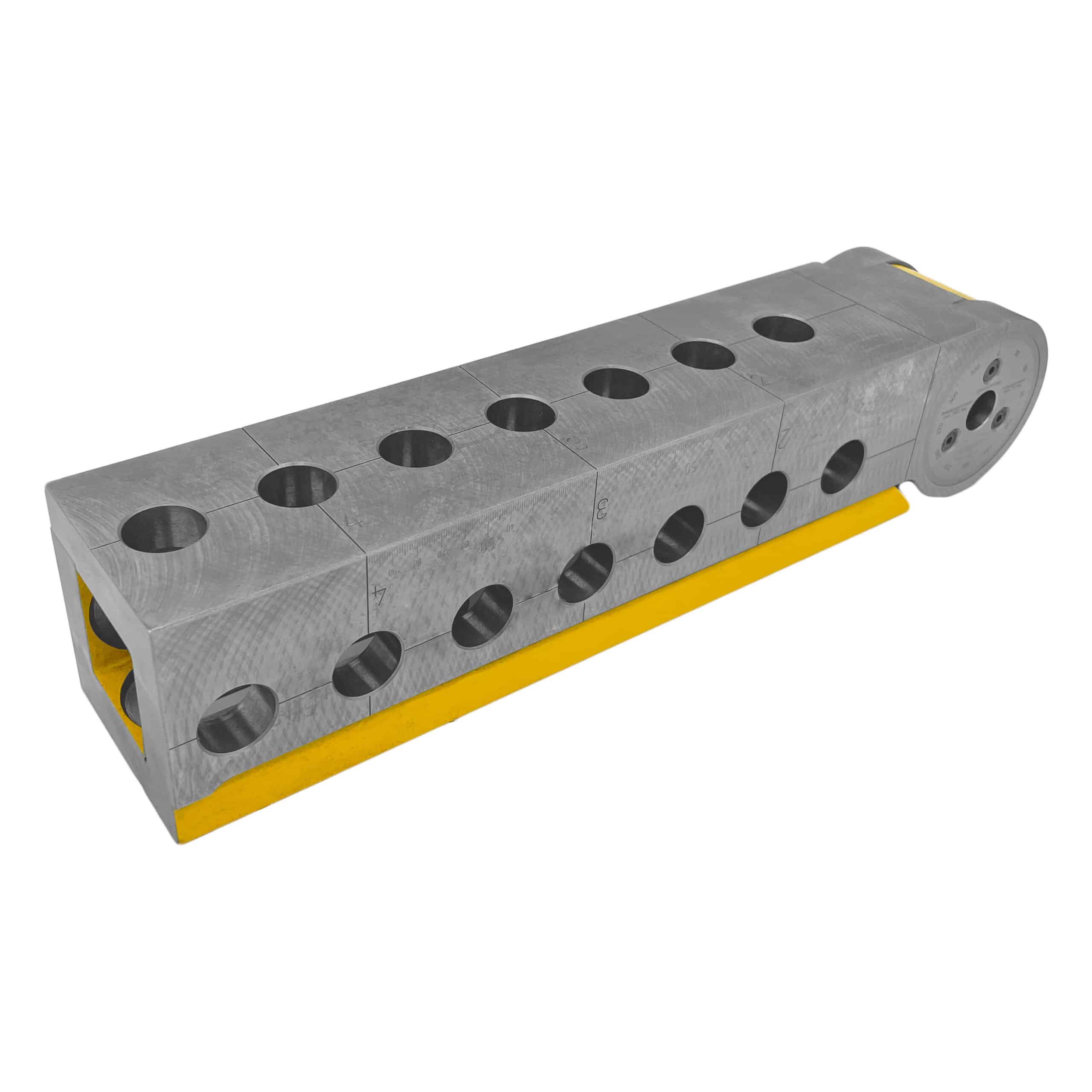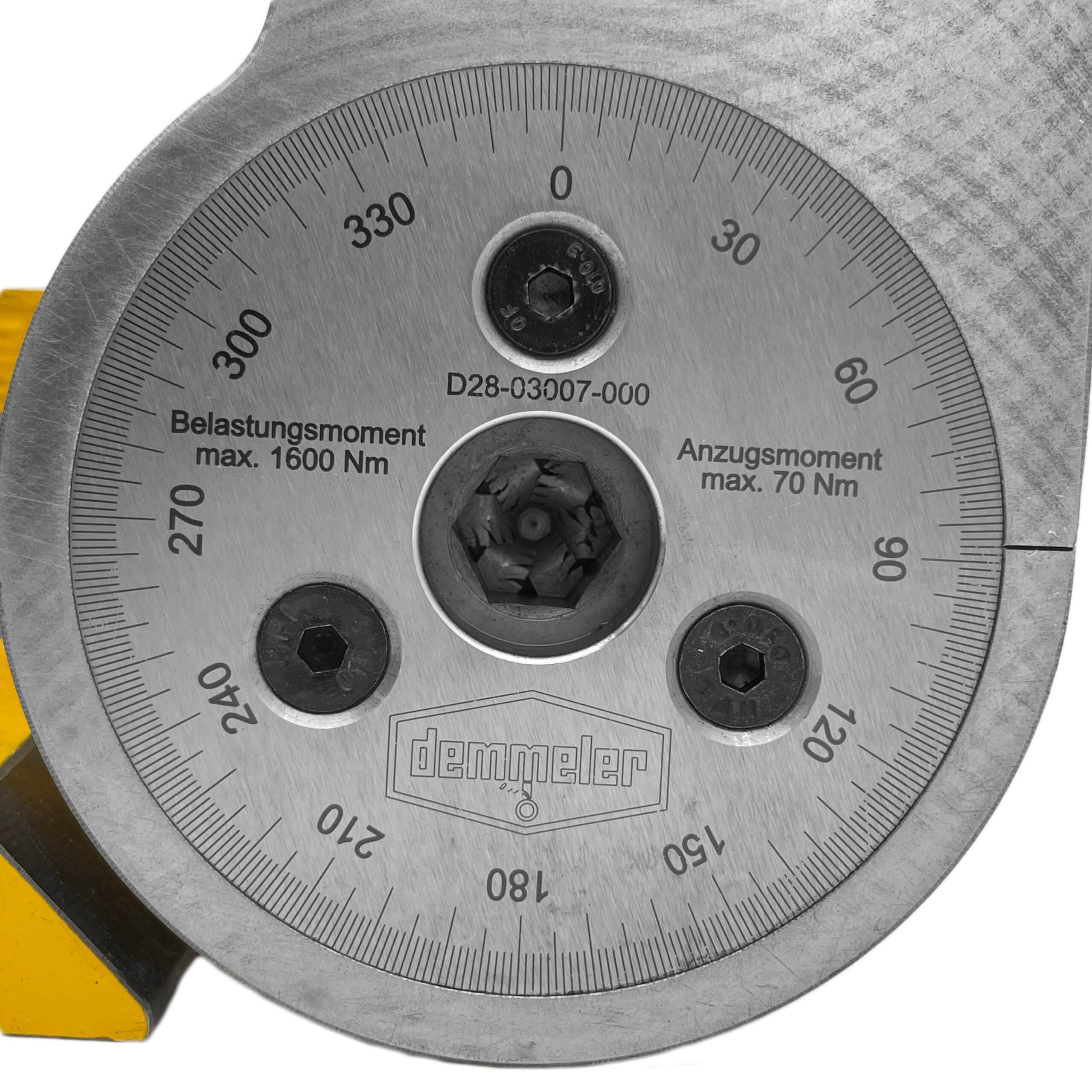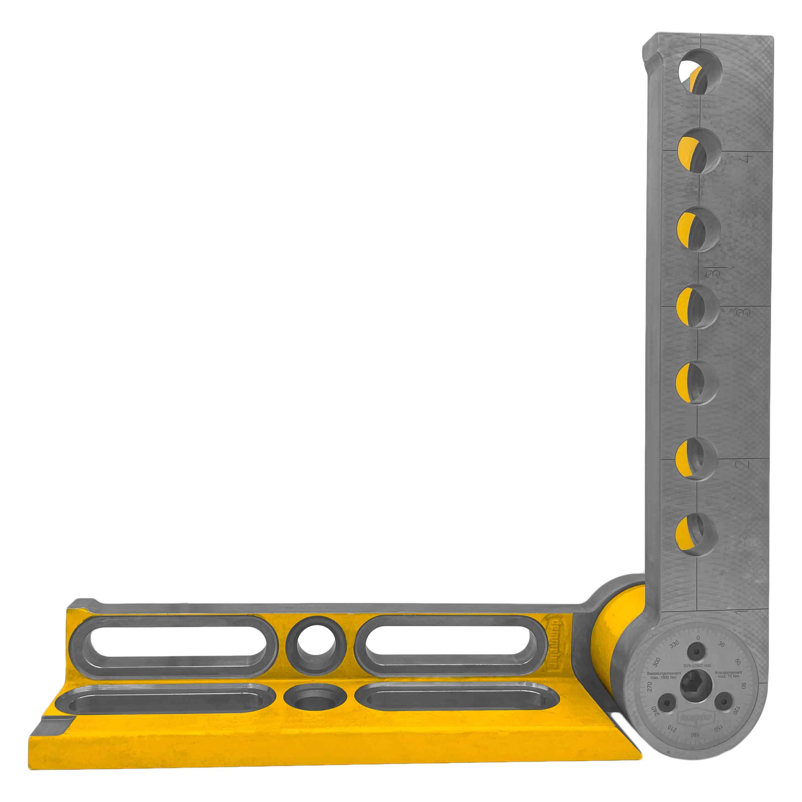 The Universal Pivot & Tilt Angle (RH) is engineered for versatile positioning with a continuously adjustable range between 0° and 225°. It features 1mm precision scaling and grid lines for maximum precision clamping, allowing for accurate dimension adjustments on the 3D worktable. The hydromechanical clamping system supports up to 1600Nm torque and is maintenance-free, ensuring reliable performance. Its combination of system bores and oblong holes offers numerous application possibilities. With the ability to be used both horizontally and vertically, and larger dimensions than part 3008 for added versatility and stability, it is a robust choice for demanding tasks. The hex screw allows for precise angle adjustments using a 14mm Allen key.